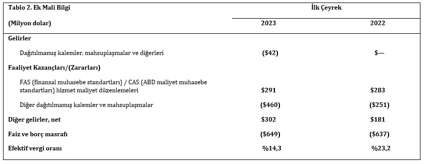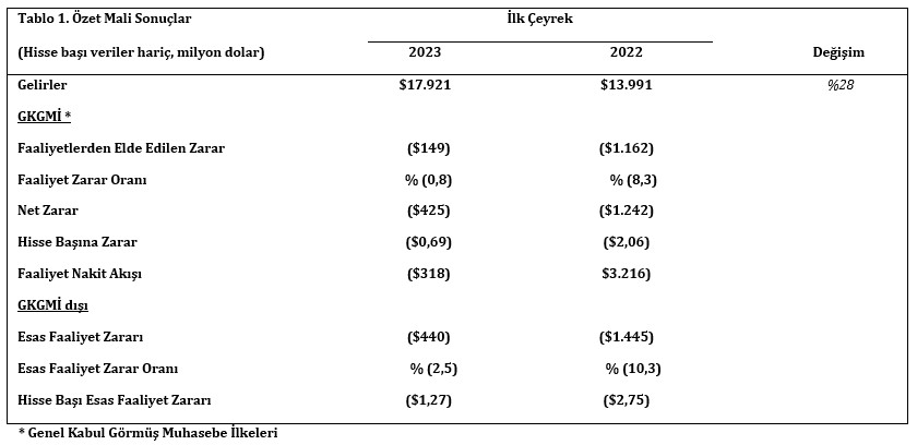 Boeing, ilk çeyrek sonuçlarını açıkladı. Buna göre; gelirler 17,9 milyar dolar, GKGMİ hisse başına zarar -0,69 dolar ve GKGMİ dışı hisse başı esas faaliyet zararı -1,27 dolar olarak gerçekleşti (Tablo 1). Boeing, bu çeyrekte -0,3 milyar dolarlık faaliyet nakit akışı ve -0,8 milyar dolarlık GKGMİ dışı serbest nakit akışı kaydederken, ticari uçaklar hacim ve performansında artış gösterdi.